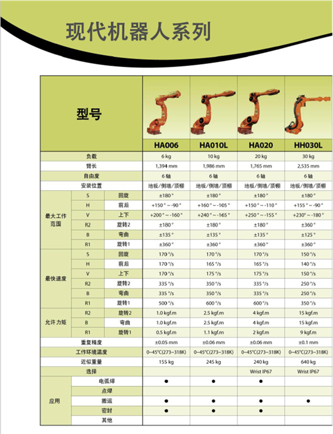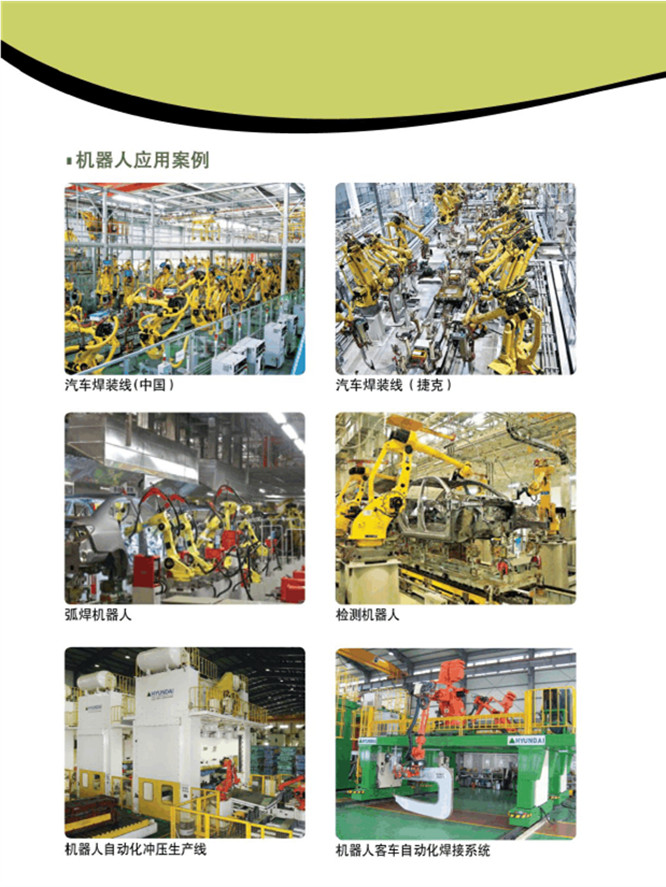 直角坐標(biāo)型工業(yè)機器人 、 圓柱坐標(biāo)型工業(yè)機器人、 圓柱坐標(biāo)型工業(yè)機器人 、多關(guān)節(jié)型工業(yè)機器人、平面關(guān)節(jié)型工業(yè)機器人。弧焊機器人、 激光焊機器人、電阻焊機器人、自動化焊接機器人、點焊機器人、等離子切割機器人、清潔機器人、上料機器人、物料輸送機器人、材料去除機器人、包裝機器人、噴漆機器人、自動鉆孔機器人、堆跺機器人、涂層機器人、去毛刺機器人、磨銷機器人、高溫噴涂機器人等。